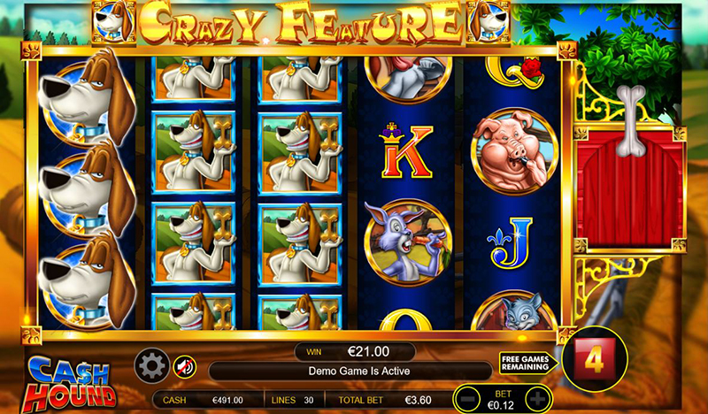 Het bonus spel bij Cash Hound staat ook wel bekend als het ‘Crazy Feature’. Met vele Wilds en hondenkoppen die omdraaien tot allemaal hetzelfde symbool zal je zien dat je wel tientallen uitbetalingen per spin krijgt. In totaal krijg je op z’n minst 6 gratis spins, al zal je zien dat er ook re-spins worden uitgedeeld zodat het aantal gratis speelbeurten oploopt.