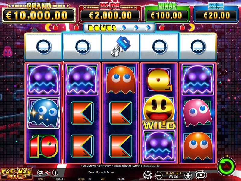 We hebben de leukste functie van Pac-Man Wild Edition nog niet besproken! Het zal je al zijn opgevallen dat boven de rollen van de gokkast een horizontale balk zit waarop bij elke spin ook figuurtjes verschijnen. Hier kunnen maar 3 soorten symbolen verschijnen: Pac-Man, een spook, en een sleutel. De spookjes komen het meest voor en leveren niets op. Leuk wordt het echter bij Pac-Man en bij de sleutels!