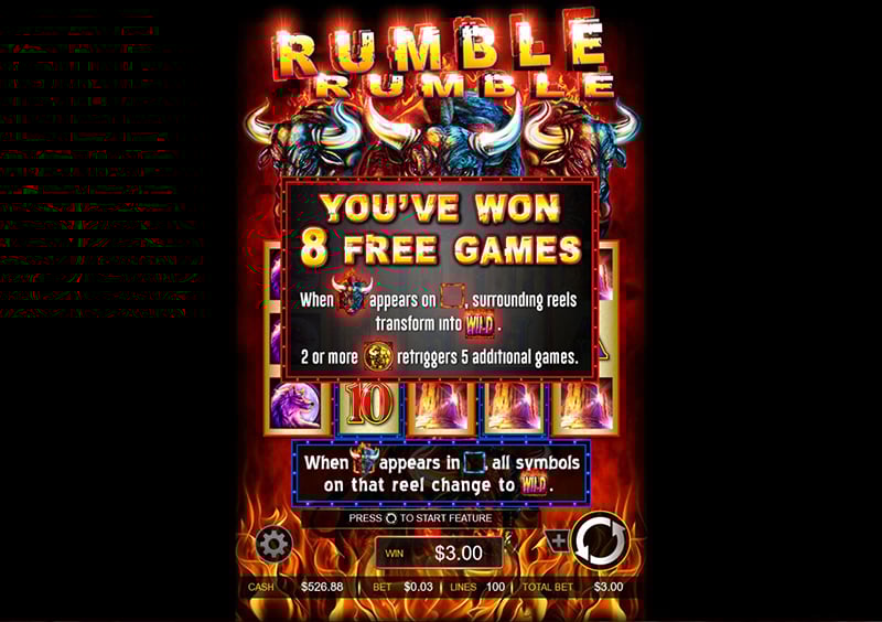 Rumble Rumble heeft een haast diabolische uitstraling met de rood-oranje vlammenzee onderaan en drie kwade stieren met stoom uit hun neuzen die op het punt staan om op te stormen uit het scherm in jouw richting! Het is erg mooi vormgegeven en je kan meteen zien dat deze video slot zijn oorsprong heeft in een fysieke speelautomaat.