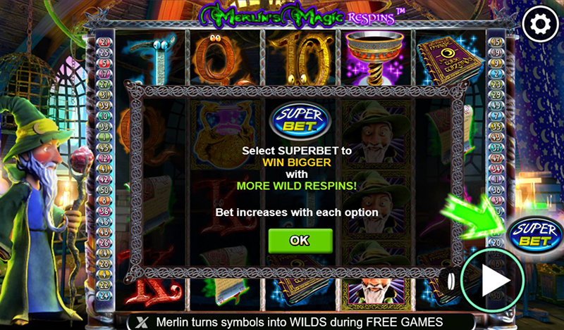 De Super Bet, oftewel de superinzet – is een extra inzet die je kan plaatsen. Je doet dit aan de hand van de meter die je rechts van de gokkast ziet staan. Je kan de Super Bet tot aan x5 instellen. Super Bet niveau 1 kost je 50 munten extra per spin, niveau 2 kost je 100 munten extra, niveau 3 kost je 300 munten extra, niveau 4 kost 250 munten extra, en het hoogste niveau 5 kost je 300 munten extra. Respectievelijk levert je dit 1, 2, 3, 4 of 5 Wild Respins op. Dit is een bonus feature dat je kan krijgen in zowel het normale spel als in het gratis spins bonusspel van Merlin’s Magic Respins. Zonder een extra Super Bet inzet krijg je geen één Wild Respin.