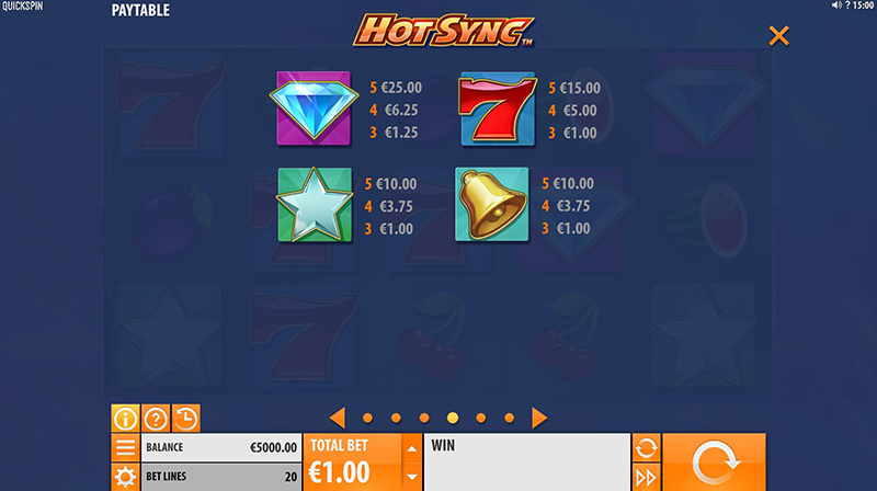 De symbolen bij Hot Sync zijn voornamelijk klassieke fruitautomaat symbolen zoals het cijfer ‘7’, kersen en pruimen. Je moet minimaal drie dezelfde symbolen naast elkaar op rij zien te krijgen op een van de in totaal 20 winstlijnen. Dit wordt altijd van links naar rechts gezien, dus het 1e symbool van een winnende combinatie zal dus altijd op de 1e rol moeten staan. Natuurlijk zijn de hoogste uitbetalingen bij dit spel de combinaties van 5 overeenkomende symbolen op rij!